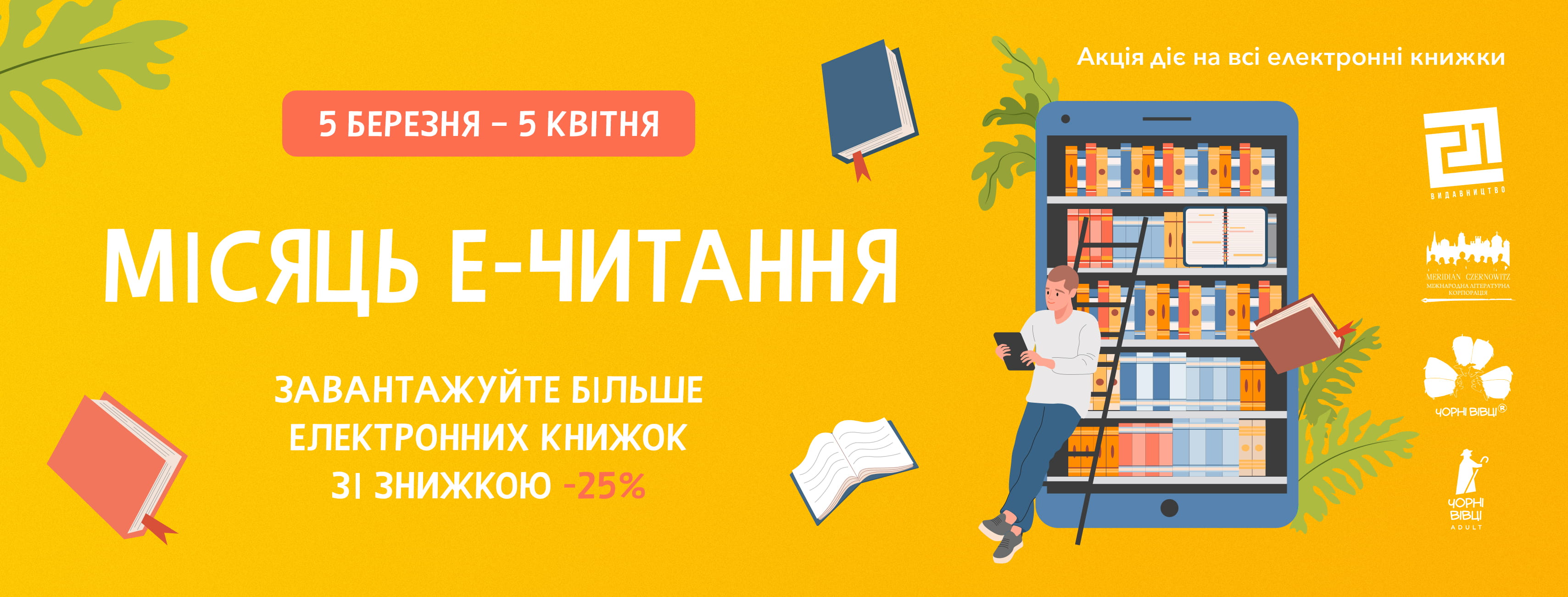 З 5 березня до 5 квітня діє знижка –25% на ВСІ електронні книжки на сайті: Видавництво 21, Чорні вівці, Чорні вівці Adult, Meridian Chernowitz.