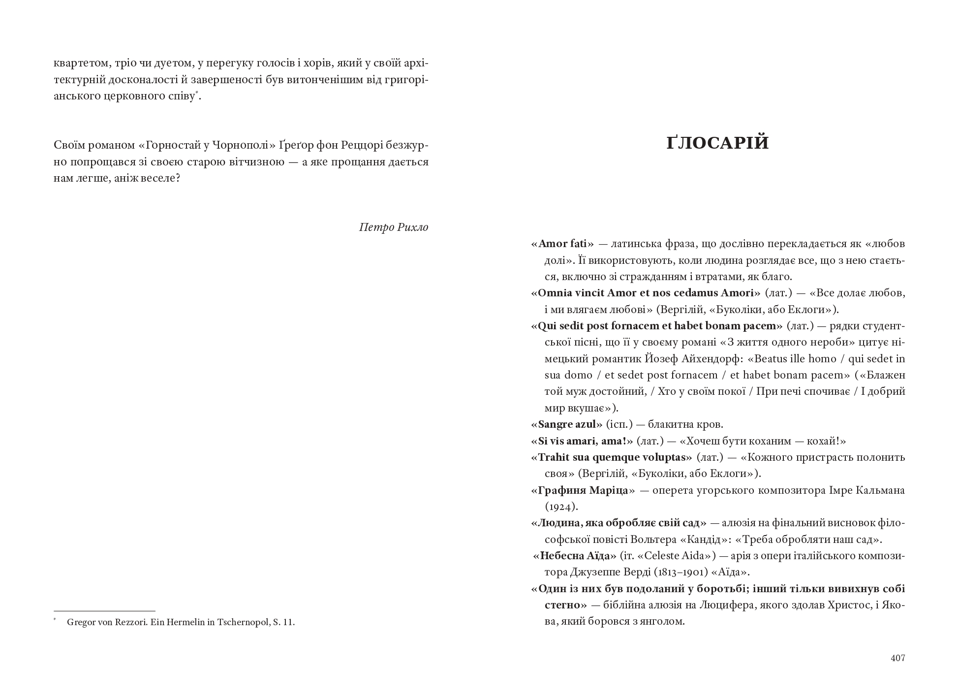 У міфічному Чорнополі, столиці фіктивної Тесковини – за цими топографічними назвами легко вгадуються Чернівці й Буковина, – майора гусарського полку Ніколауса Тільді, який має гіпертрофоване почуття честі, вважають «білою вороною». Ексцентричні ескапади цього новітнього Дона Кіхота, що розгортаються в «маґрібінській» атмосфері міста, де ницість не вважається провиною, завершуються для нього фатально. Автор змальовує нам неповторну галерею людських типів, які нагадують ґротескних героїв Лоуренса Стерна або Гайміто фон Додерера. Роман Ґреґора фон Реццорі «Горностай у Чорнополі», увінчаний 1958 року премією імені Теодора Фонтане, досі залишається знаковим твором німецької літератури другої половини ХХ століття.