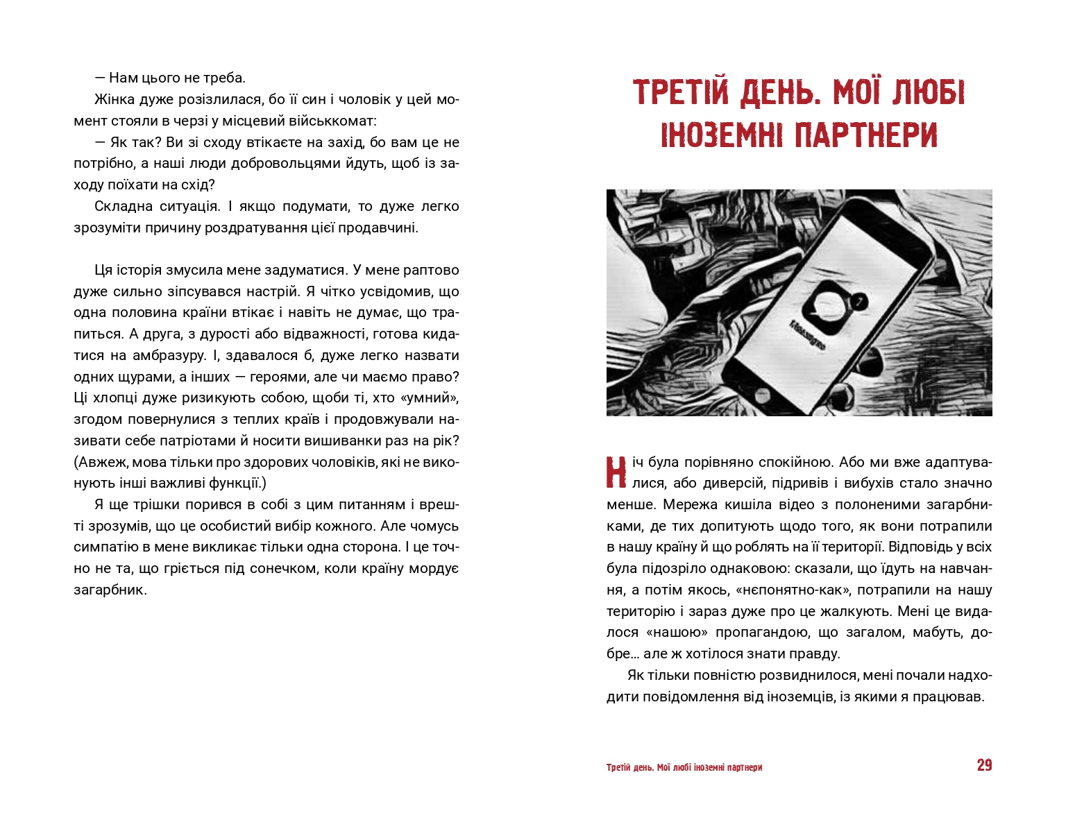 ????Один з розділів книги містить вражаючі історії різних людей: лікарів, музикантів, акторів, блогерів та телеведучих. Вони згадують, як зустріли перші дні війни у Києві, Львові, Франківську, Ірпіні, Чернівцях.Це розповіді, що пришвидшують пульс, вони про надскладні рішення, про внутрішнє переродження та усвідомлення своєї національної ідентичності.