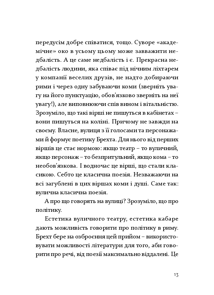 Перш за все цю збірку не варто вважати «найкращими» віршами Брехта. Адже що тут є кращим? Що гіршим? Це – як обирати найкращих птахів у строкатій і галасливій пташиній зграї, що зривається з вокзального піддашшя. Зграя заворожує сама собою: своїм рухом, своєю силою та – передусім – своїм галасом. У випадку з поетичним доробком Брехта важливо розуміти не лише текст, а й контекст. Читаючи цю збірку, ви помітите, наскільки неоднорідними (і неоднозначними) є вміщені в ній твори. Що цілком природно: Брехт писав класичні сонети, зонги для співу під гітару, тексти для театральної сцени, які мали виконувати своє драматургічне завдання, не завжди очевидне поза сюжетними перипетіями та психологією персонажів. Також він писав політичні віршовані памфлети, відозви, маніфести (навіть «Маніфест компартії» переписав гекзаметром, але його тут немає, не шукайте). Крім того, він писав парадоксальні пронизливі верлібри. Ну і, звісно, цілком академічні римовані балади. Ще він легко вдавався до стилізацій і вільних запозичень – як жанрових, так і суто стилістичних. Ще він захоплювався Сходом, що особливо відбилося на його пізніх віршах. Ще він мав здатність перетворювати на вірші все, що траплялося йому на очі, тож поезії його часто нагадують фрагментарні, обірвані, спонтанні щоденникові записи. Та що там нагадують: часто вони такими і є. Одне слово, метою цієї збірки перекладів було показати – бодай штрихово, контурно, побіжно – весь цей безмір ідей, задумів і методів, увесь брехтівський огром пошуків і зацікавлень, тем і характерів, улюблених засобів і найзнаковіших персонажів. Тому це збірка не так «найкращих», як «найрізноманітніших» віршів Брехта.